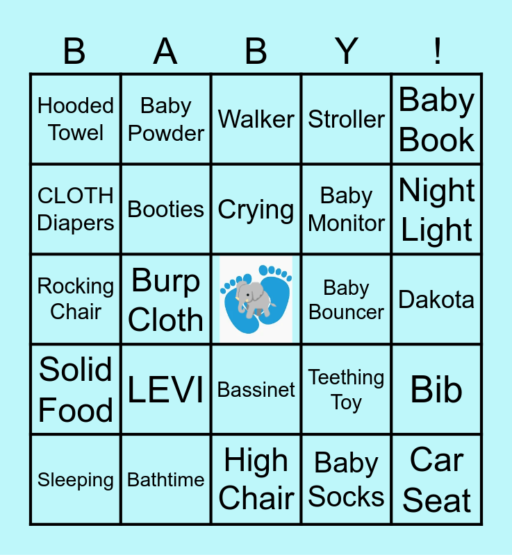 This bingo card has a free space and 49 words: Bottle, Car Seat, Play- Pen, High Chair, LEVI, Rattle, Baby Powder, Baby Lotion, CLOTH Diapers, Pacifier, Booties, Stroller, Bib, Teething Toy, Blanket, Baby Boy, Crying, Baby Bouncer, Onesie, Baby Book, Burp Cloth, Baby Socks, Hooded Towel, Baby Monitor, Mittens, Night Light, Sleeping, Crib, Bassinet, Solid Food, Milk, Diaper Rash, Spit-up, Swaddle, Bathtime, Stork, Labor, Karla, Dakota, Baby Wipes, Thermometer, Baby Blocks, Nursery Rhymes, May 26th, Rocking Chair, Walker, Nursery, Colic and Baby Swing.