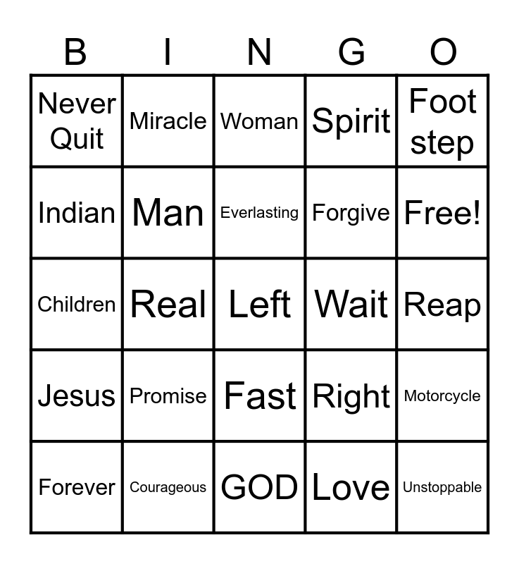 This bingo card has a free space and 31 words: Stong, Courageous, Everlasting, Favor, Foot step, Never Quit, Real, GOD, Forgive, Unstoppable, Forever, Promise, Love, Be careful, Jesus, Amen, Fast, Wait, Reap, Showtime, Miracle, Harvest, Right, Free!, Children, Man, Woman, Spirit, Motorcycle, Indian and Harley.