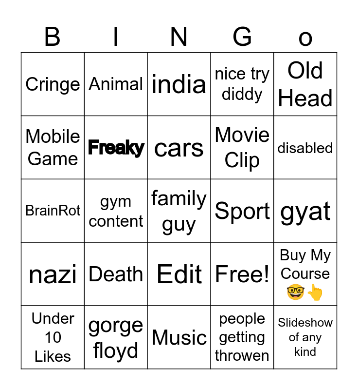 This bingo card has 25 words: Death, Music, cars, Under 10 Likes, Old Head, Cringe, Mobile Game, Animal, Sport, Edit, Movie Clip, BrainRot, Free!, Buy My Course🤓👆, Freaky, Slideshow of any kind, gyat, india, disabled, gym content, family guy, gorge floyd, nazi, nice try diddy and people getting throwen.