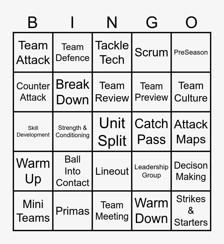 This bingo card has 25 words: Warm Up, Primas, Unit Split, Warm Down, PreSeason, Team Attack, Team Defence, Tackle Tech, Catch Pass, Decison Making, Counter Attack, Break Down, Team Meeting, Leadership Group, Team Culture, Mini Teams, Strength & Conditioning, Team Review, Team Preview, Attack Maps, Skill Development, Ball Into Contact, Lineout, Scrum and Strikes & Starters.