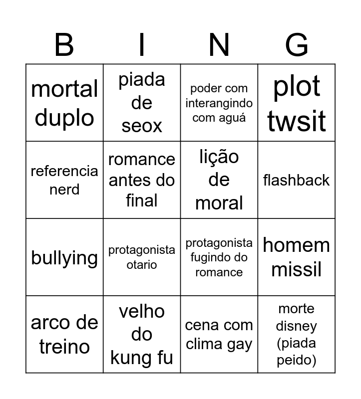 This bingo card has 16 words: velho do kung fu, homem missil, poder com interangindo com aguá, mortal duplo, bullying, piada de seox, protagonista fugindo do romance, cena com clima gay, referencia nerd, romance antes do final, arco de treino, plot twsit, protagonista otario, flashback, lição de moral and morte disney (piada peido).