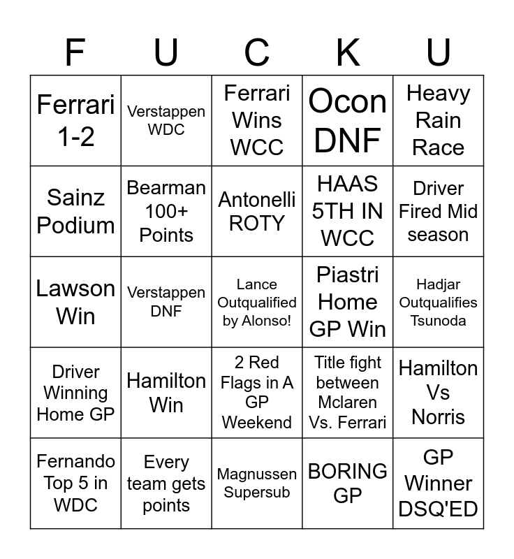 This bingo card has a free space and 24 words: Hamilton Win, Every team gets points, Antonelli ROTY, Fernando Top 5 in WDC, Heavy Rain Race, Ferrari 1-2, Sainz Podium, Verstappen WDC, Piastri Home GP Win, 2 Red Flags in A GP Weekend, HAAS 5TH IN WCC, Lawson Win, Title fight between Mclaren Vs. Ferrari, Hamilton Vs Norris, Bearman 100+ Points, BORING GP, Hadjar Outqualifies Tsunoda, Ferrari Wins WCC, Driver Fired Mid season, Verstappen DNF, GP Winner DSQ'ED, Driver Winning Home GP, Ocon DNF and Magnussen Supersub.