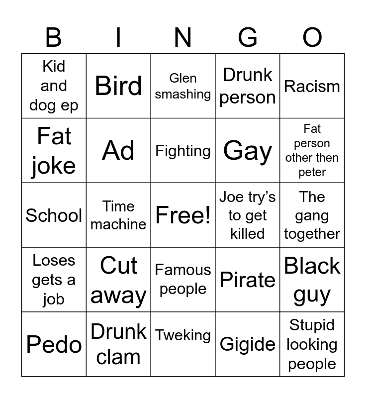 This bingo card has a free space and 24 words: Cut away, Drunk clam, Fighting, Pedo, Racism, Kid and dog ep, Fat joke, Bird, Joe try’s to get killed, Famous people, Gay, School, Pirate, Black guy, Ad, Gigide, The gang together, Glen smashing, Fat person other then peter, Time machine, Stupid looking people, Loses gets a job, Drunk person and Tweking.