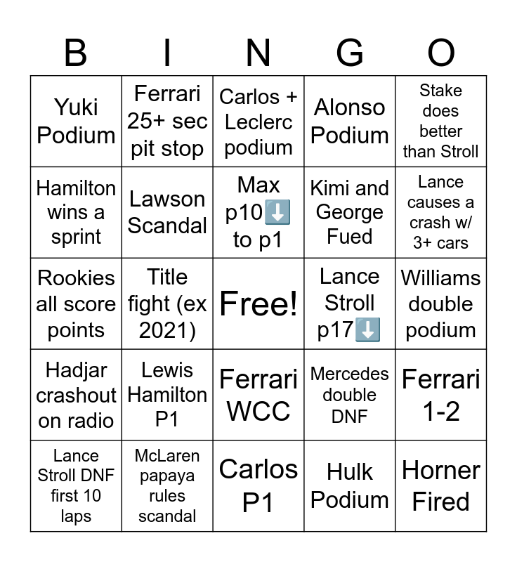 This bingo card has a free space and 24 words: Lance Stroll DNF first 10 laps, Lewis Hamilton P1, Max p10⬇️ to p1, Hulk Podium, Stake does better than Stroll, Yuki Podium, Ferrari 25+ sec pit stop, Carlos + Leclerc podium, Lance Stroll p17⬇️, Williams double podium, Rookies all score points, Lawson Scandal, Mercedes double DNF, Ferrari 1-2, Hamilton wins a sprint, McLaren papaya rules scandal, Carlos P1, Alonso Podium, Lance causes a crash w/ 3+ cars, Hadjar crashout on radio, Title fight (ex 2021), Ferrari WCC, Kimi and George Fued and Horner Fired.
