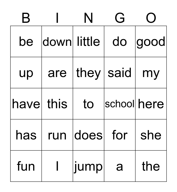 This bingo card has 25 words: run, jump, they, fun, good, be, up, down, school, does, said, have, for, she, are, the, here, little, my, this, to, I, has, do and a.