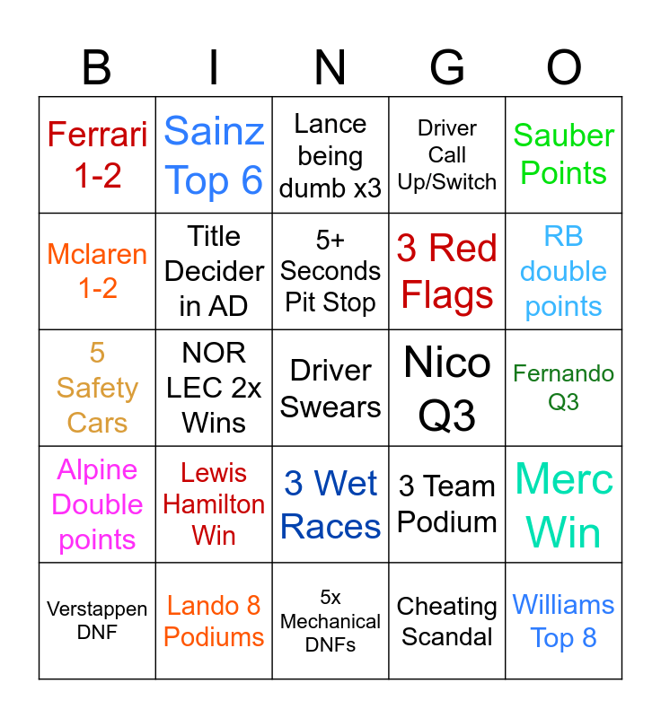 This bingo card has a free space and 24 words: Lewis Hamilton Win, Lando 8 Podiums, 5+ Seconds Pit Stop, Verstappen DNF, Sauber Points, Ferrari 1-2, Mclaren 1-2, Sainz Top 6, Nico Q3, 3 Wet Races, 3 Red Flags, 5 Safety Cars, 3 Team Podium, Merc Win, Title Decider in AD, Cheating Scandal, Fernando Q3, Lance being dumb x3, RB double points, NOR LEC 2x Wins, Williams Top 8, Alpine Double points, Driver Call Up/Switch and 5x Mechanical DNFs.