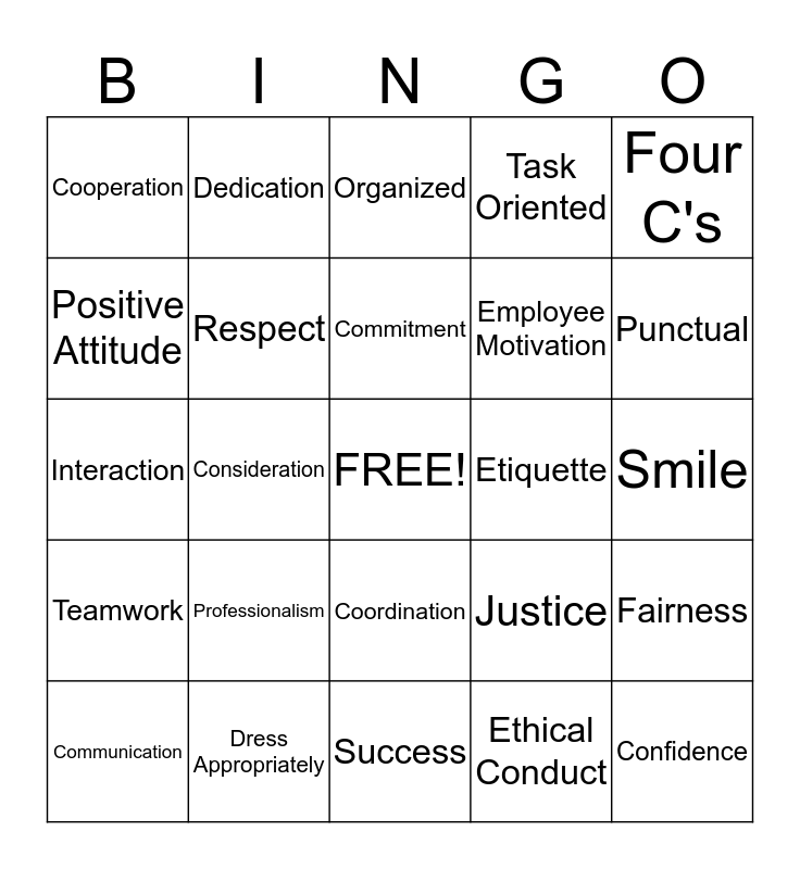 This bingo card has a free space and 24 words: Professionalism, Dress Appropriately, Commitment, Communication, Four C's, Cooperation, Positive Attitude, Dedication, Etiquette, Coordination, Employee Motivation, Interaction, Justice, Fairness, Respect, Ethical Conduct, Smile, Organized, Punctual, Consideration, Confidence, Teamwork, Task Oriented and Success.