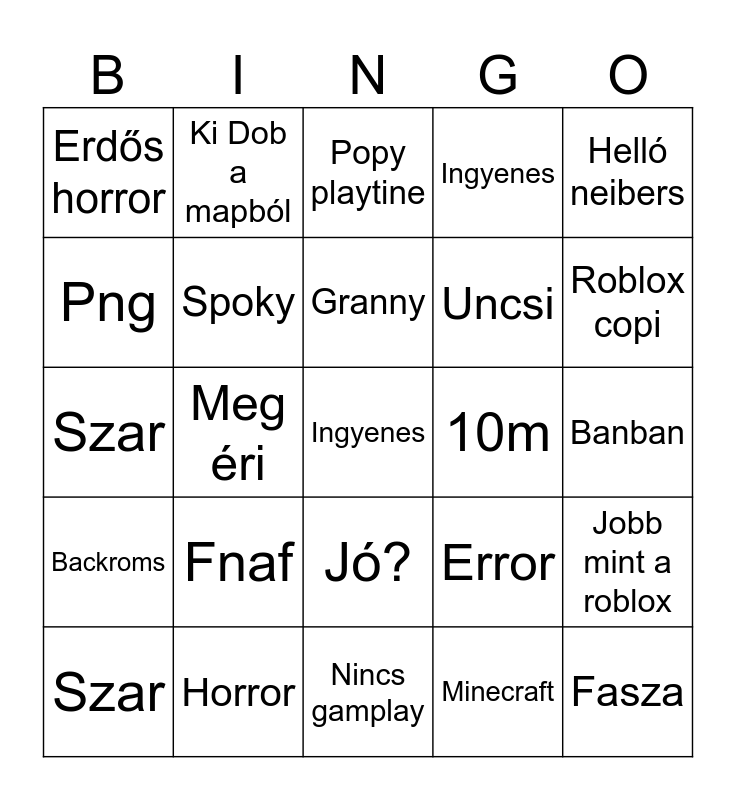 This bingo card has a free space and 24 words: Szar, Fnaf, Granny, Minecraft, Helló neibers, Erdős horror, Ki Dob a mapból, Popy playtine, 10m, Banban, Szar, Spoky, Error, Jobb mint a roblox, Png, Horror, Nincs gamplay, Ingyenes, Roblox copi, Backroms, Meg éri, Jó?, Uncsi and Fasza.