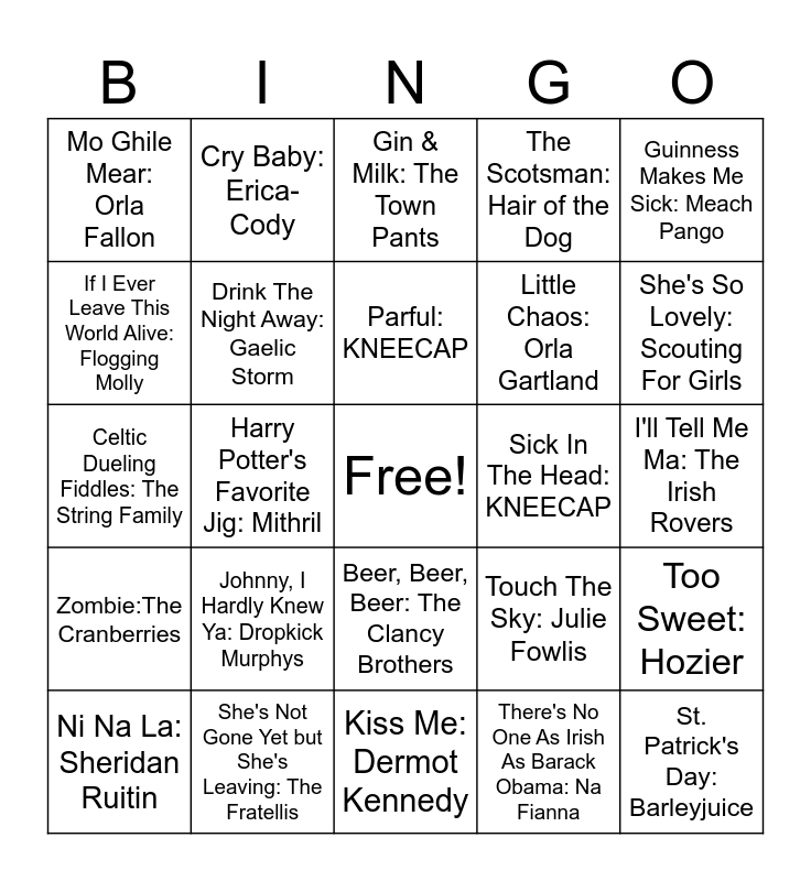 This bingo card has a free space and 49 words: Nancy Drinks Tequila: Barleyjuice, St. Patrick's Day: Barleyjuice, Another Irish Drinking Song: Da Vinci's Notebook, Kiss Me: Dermot Kennedy, Johnny, I Hardly Knew Ya: Dropkick Murphys, Rose Tattoo: Dropkick Murphys, Cry Baby: Erica-Cody, Drunken Lullabies: Flogging Molly, If I Ever Leave This World Alive: Flogging Molly, No You Girls: Franz Ferdinand, Drink The Night Away: Gaelic Storm, The Scotsman: Hair of the Dog, Too Sweet: Hozier, Touch The Sky: Julie Fowlis, HowIs the Wolf: Kila, Suas Sios: Kila, Parful: KNEECAP, Sick In The Head: KNEECAP, Drink Me Up: LYRA, Guinness Makes Me Sick: Meach Pango, Harry Potter's Favorite Jig: Mithril, There's No One As Irish As Barack Obama: Na Fianna, Mo Ghile Mear: Orla Fallon, Little Chaos: Orla Gartland, I Should Have Stayed at Home: Ryan Mack, She's So Lovely: Scouting For Girls, Ni Na La: Sheridan Ruitin, I Am Ireland: St Patrick's Day Songs, Beer, Beer, Beer: The Clancy Brothers, Zombie:The Cranberries, Linger: The Cranberries, Follow Me up to Carlow: The Davitts, Seven Drunken Nights: The Dubliners, Chelsea Dagger: The Fratellis, She's Not Gone Yet but She's Leaving: The Fratellis, The Rocky Road To Dublin: The High Kings, Buy Us a Drink: The Irish Rovers, Whores and Hounds: The Irish Rovers, I'll Tell Me Ma: The Irish Rovers, Sixth and Porter: The Kreellers, Irish Way: The O'Reilly's and the Paddyhats, If I Should Fall from Grace with God: The Pogues, I'm Gonna Be (500 Miles): The Proclaimers, I'm on My Way, Celtic Dueling Fiddles: The String Family, Gin & Milk: The Town Pants, Fisherman's Blues: The Waterboys, Grace: The Wolfe Tones and Bodhran: Young Dubliners.