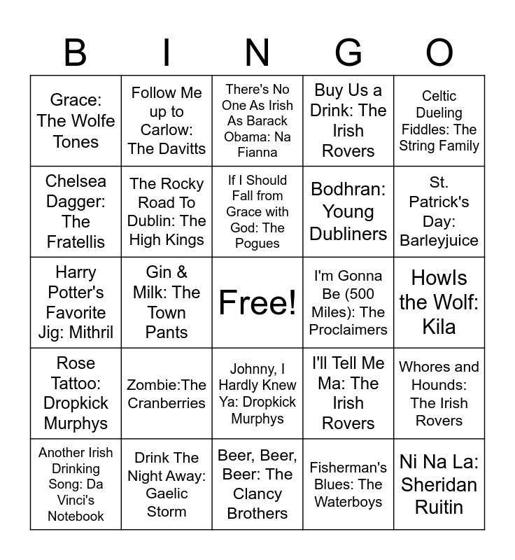 This bingo card has a free space and 49 words: She's So Lovely: Scouting For Girls, Ni Na La: Sheridan Ruitin, I Am Ireland: St Patrick's Day Songs, Beer, Beer, Beer: The Clancy Brothers, Zombie:The Cranberries, Linger: The Cranberries, Follow Me up to Carlow: The Davitts, Seven Drunken Nights: The Dubliners, Chelsea Dagger: The Fratellis, She's Not Gone Yet but She's Leaving: The Fratellis, The Rocky Road To Dublin: The High Kings, Buy Us a Drink: The Irish Rovers, Whores and Hounds: The Irish Rovers, I'll Tell Me Ma: The Irish Rovers, Sixth and Porter: The Kreellers, Irish Way: The O'Reilly's and the Paddyhats, If I Should Fall from Grace with God: The Pogues, I'm Gonna Be (500 Miles): The Proclaimers, I'm on My Way, Celtic Dueling Fiddles: The String Family, Gin & Milk: The Town Pants, Fisherman's Blues: The Waterboys, Grace: The Wolfe Tones, Bodhran: Young Dubliners, Nancy Drinks Tequila: Barleyjuice, St. Patrick's Day: Barleyjuice, Another Irish Drinking Song: Da Vinci's Notebook, Kiss Me: Dermot Kennedy, Johnny, I Hardly Knew Ya: Dropkick Murphys, Rose Tattoo: Dropkick Murphys, Cry Baby: Erica-Cody, Drunken Lullabies: Flogging Molly, If I Ever Leave This World Alive: Flogging Molly, No You Girls: Franz Ferdinand, Drink The Night Away: Gaelic Storm, The Scotsman: Hair of the Dog, Too Sweet: Hozier, Touch The Sky: Julie Fowlis, HowIs the Wolf: Kila, Suas Sios: Kila, Parful: KNEECAP, Sick In The Head: KNEECAP, Drink Me Up: LYRA, Guinness Makes Me Sick: Meach Pango, Harry Potter's Favorite Jig: Mithril, There's No One As Irish As Barack Obama: Na Fianna, Mo Ghile Mear: Orla Fallon, Little Chaos: Orla Gartland and I Should Have Stayed at Home: Ryan Mack.