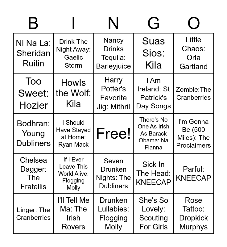 This bingo card has a free space and 49 words: Johnny, I Hardly Knew Ya: Dropkick Murphys, Rose Tattoo: Dropkick Murphys, Cry Baby: Erica-Cody, Drunken Lullabies: Flogging Molly, If I Ever Leave This World Alive: Flogging Molly, No You Girls: Franz Ferdinand, Drink The Night Away: Gaelic Storm, The Scotsman: Hair of the Dog, Too Sweet: Hozier, Touch The Sky: Julie Fowlis, HowIs the Wolf: Kila, Suas Sios: Kila, Parful: KNEECAP, Sick In The Head: KNEECAP, Drink Me Up: LYRA, Guinness Makes Me Sick: Meach Pango, Harry Potter's Favorite Jig: Mithril, There's No One As Irish As Barack Obama: Na Fianna, Mo Ghile Mear: Orla Fallon, Little Chaos: Orla Gartland, I Should Have Stayed at Home: Ryan Mack, She's So Lovely: Scouting For Girls, Ni Na La: Sheridan Ruitin, I Am Ireland: St Patrick's Day Songs, Beer, Beer, Beer: The Clancy Brothers, Zombie:The Cranberries, Linger: The Cranberries, Follow Me up to Carlow: The Davitts, Seven Drunken Nights: The Dubliners, Chelsea Dagger: The Fratellis, She's Not Gone Yet but She's Leaving: The Fratellis, The Rocky Road To Dublin: The High Kings, Buy Us a Drink: The Irish Rovers, Whores and Hounds: The Irish Rovers, I'll Tell Me Ma: The Irish Rovers, Sixth and Porter: The Kreellers, Irish Way: The O'Reilly's and the Paddyhats, If I Should Fall from Grace with God: The Pogues, I'm Gonna Be (500 Miles): The Proclaimers, I'm on My Way: The Proclaimers, Celtic Dueling Fiddles: The String Family, Gin & Milk: The Town Pants, Fisherman's Blues: The Waterboys, Grace: The Wolfe Tones, Bodhran: Young Dubliners, Nancy Drinks Tequila: Barleyjuice, St. Patrick's Day: Barleyjuice, Another Irish Drinking Song: Da Vinci's Notebook and Kiss Me: Dermot Kennedy.