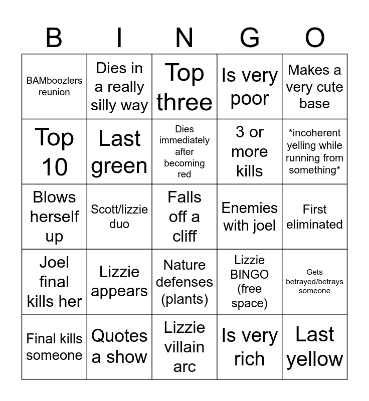 This bingo card has 25 words: Lizzie appears, Lizzie villain arc, Dies immediately after becoming red, Final kills someone, Makes a very cute base, BAMboozlers reunion, Top 10, Dies in a really silly way, Enemies with joel, Nature defenses (plants), 3 or more kills, Blows herself up, Lizzie BINGO (free space), Gets betrayed/betrays someone, Last green, Last yellow, First eliminated, Top three, *incoherent yelling while running from something*, Scott/lizzie duo, Falls off a cliff, Quotes a show, Joel final kills her, Is very poor and Is very rich.