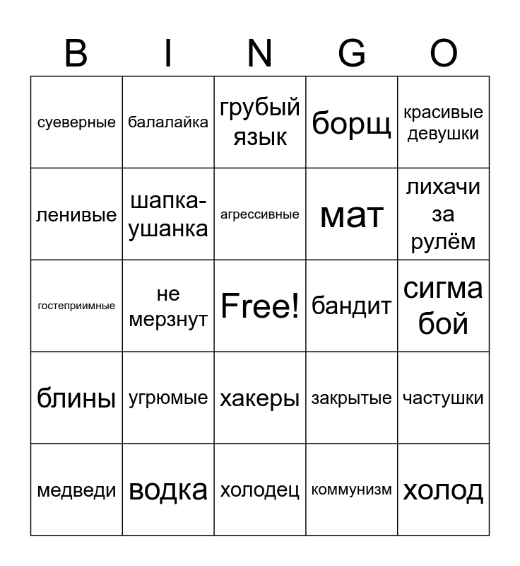 This bingo card has a free space and 24 words: угрюмые, водка, агрессивные, медведи, красивые девушки, суеверные, ленивые, балалайка, бандит, хакеры, мат, гостеприимные, закрытые, частушки, шапка-ушанка, коммунизм, сигма бой, грубый язык, лихачи за рулём, не мерзнут, холод, блины, борщ and холодец.