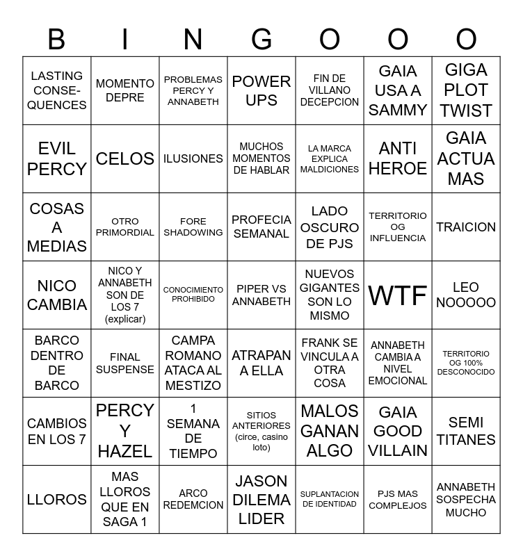 This bingo card has a free space and 48 words: MALOS GANAN ALGO, ANTI HEROE, JASON DILEMA LIDER, NICO Y ANNABETH SON DE LOS 7 (explicar), FORE SHADOWING, LEO NOOOOO, MOMENTO DEPRE, MAS LLOROS QUE EN SAGA 1, GAIA USA A SAMMY, ATRAPAN A ELLA, GIGA PLOT TWIST, POWER UPS, TERRITORIO OG INFLUENCIA, LADO OSCURO DE PJS, CAMBIOS EN LOS 7, WTF, EVIL PERCY, GAIA ACTUA MAS, GAIA GOOD VILLAIN, FIN DE VILLANO DECEPCION, LA MARCA EXPLICA MALDICIONES, CONOCIMIENTO PROHIBIDO, LASTING CONSE-QUENCES, CELOS, SEMI TITANES, ILUSIONES, TRAICION, LLOROS, PROFECIA SEMANAL, OTRO PRIMORDIAL, PJS MAS COMPLEJOS, NUEVOS GIGANTES SON LO MISMO, TERRITORIO OG 100% DESCONOCIDO, PERCY Y HAZEL, NICO CAMBIA, FRANK SE VINCULA A OTRA COSA, ANNABETH CAMBIA A NIVEL EMOCIONAL, COSAS A MEDIAS, CAMPA ROMANO ATACA AL MESTIZO, 1 SEMANA DE TIEMPO, BARCO DENTRO DE BARCO, ANNABETH SOSPECHA MUCHO, PROBLEMAS PERCY Y ANNABETH, ARCO REDEMCION, MUCHOS MOMENTOS DE HABLAR, SITIOS ANTERIORES (circe, casino loto), FINAL SUSPENSE and SUPLANTACION DE IDENTIDAD.