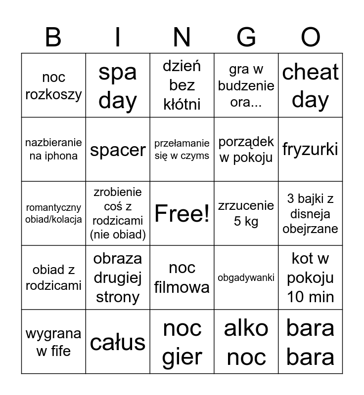 This bingo card has a free space and 24 words: obraza drugiej strony, całus, przełamanie się w czyms, wygrana w fife, cheat day, noc rozkoszy, nazbieranie na iphona, spa day, zrzucenie 5 kg, noc filmowa, porządek w pokoju, romantyczny obiad/kolacja, obgadywanki, kot w pokoju 10 min, spacer, alko noc, 3 bajki z disneja obejrzane, dzień bez kłótni, fryzurki, zrobienie coś z rodzicami (nie obiad), bara bara, obiad z rodzicami, gra w budzenie ora... and noc gier.
