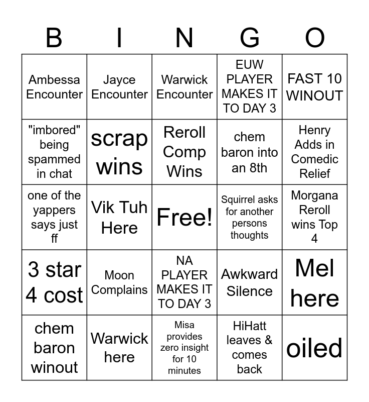 This bingo card has a free space and 24 words: Moon Complains, Warwick here, Reroll Comp Wins, chem baron winout, FAST 10 WINOUT, Ambessa Encounter, "imbored" being spammed in chat, Jayce Encounter, Squirrel asks for another persons thoughts, NA PLAYER MAKES IT TO DAY 3, chem baron into an 8th, one of the yappers says just ff, Awkward Silence, Mel here, scrap wins, HiHatt leaves & comes back, Morgana Reroll wins Top 4, Warwick Encounter, Henry Adds in Comedic Relief, Vik Tuh Here, oiled, 3 star 4 cost, EUW PLAYER MAKES IT TO DAY 3 and Misa provides zero insight for 10 minutes.
