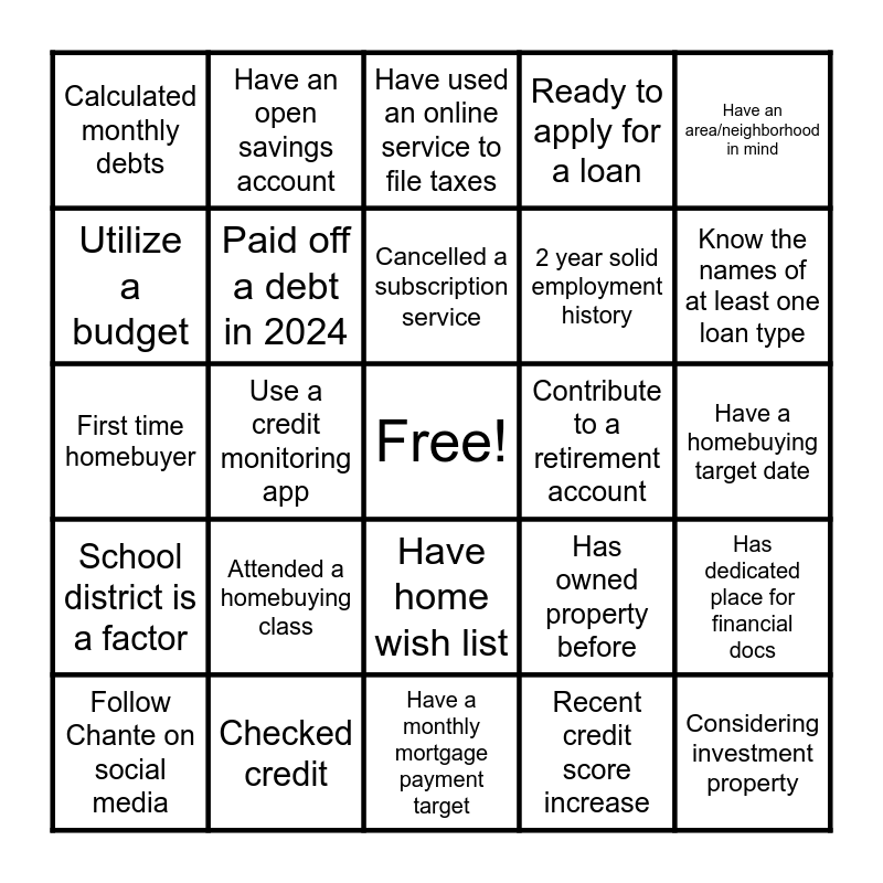 This bingo card has a free space and 24 words: Attended a homebuying class, Checked credit, Cancelled a subscription service, Follow Chante on social media, Have an area/neighborhood in mind, Calculated monthly debts, Utilize a budget, Have an open savings account, Contribute to a retirement account, Have home wish list, 2 year solid employment history, First time homebuyer, Has owned property before, Has dedicated place for financial docs, Paid off a debt in 2024, Recent credit score increase, Have a homebuying target date, Have used an online service to file taxes, Know the names of at least one loan type, Use a credit monitoring app, Considering investment property, School district is a factor, Ready to apply for a loan and Have a monthly mortgage payment target.