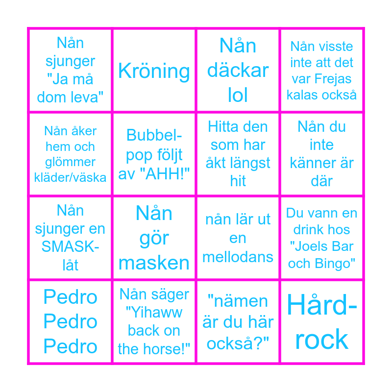 This bingo card has 16 words: Nån säger "Yihaww back on the horse!", Du vann en drink hos "Joels Bar och Bingo", Nån däckar lol, Nån sjunger "Ja må dom leva", Nån sjunger en SMASK-låt, Kröning, nån lär ut en mellodans, "nämen är du här också?", Nån åker hem och glömmer kläder/väska, Bubbel-pop följt av "AHH!", Pedro Pedro Pedro, Nån visste inte att det var Frejas kalas också, Nån gör masken, Nån du inte känner är där, Hitta den som har åkt längst hit and Hård-rock.