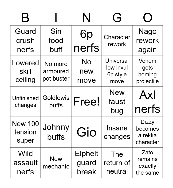 This bingo card has a free space and 24 words: Johnny buffs, New mechanic, No new move, Wild assault nerfs, Nago rework again, Guard crush nerfs, Lowered skill ceiling, Sin food buff, New faust bug, Gio, Universal low invul 6p style move, Unfinished changes, Insane changes, Dizzy becomes a rekka character, No more armoured pot buster, The return of neutral, Axl nerfs, 6p nerfs, Venom gets homing projectile, Goldlewis buffs, Zato remains exactly the same, New 100 tension super, Character rework and Elphelt guard break.