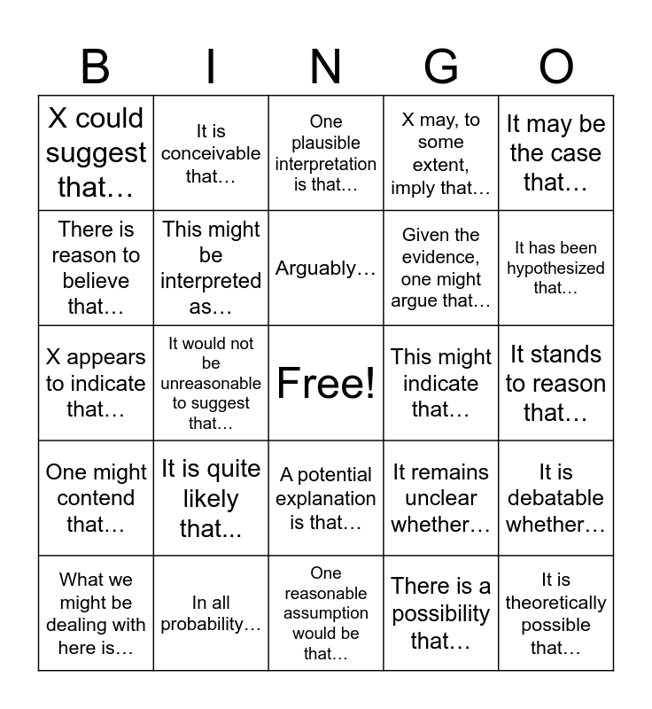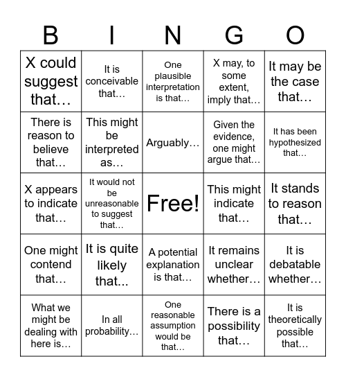 This bingo card has a free space and 24 words: It is quite likely that..., In all probability…, Arguably…, What we might be dealing with here is…, It may be the case that…, X could suggest that…, There is reason to believe that…, It is conceivable that…, This might indicate that…, A potential explanation is that…, Given the evidence, one might argue that…, X appears to indicate that…, It remains unclear whether…, It is debatable whether…, This might be interpreted as…, There is a possibility that…, It stands to reason that…, One plausible interpretation is that…, It has been hypothesized that…, It would not be unreasonable to suggest that…, It is theoretically possible that…, One might contend that…, X may, to some extent, imply that… and One reasonable assumption would be that….
