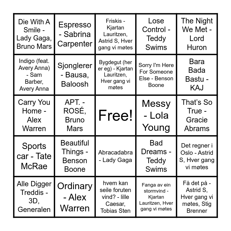 This bingo card has a free space and 30 words: Ordinary - Alex Warren, I min bil - Veronica Maggio, APT. - ROSÉ, Bruno Mars, Anxiety - Doechii, Die With A Smile - Lady Gaga, Bruno Mars, Friskis - Kjartan Lauritzen, Astrid S, Hver gang vi møtes, Sjonglerer - Bausa, Baloosh, Abracadabra - Lady Gaga, Messy - Lola Young, hvem kan seile foruten vind? - lille Caesar, Tobias Sten, That’s So True - Gracie Abrams, Få det på - Astrid S, Hver gang vi møtes, Stig Brenner, Fanga av ein stormvind - Kjartan Lauritzen, Hver gang vi møtes, SAMMEN - Marstein, Annika, Bara Bada Bastu - KAJ, BIRDS OF A FEATHER - Billie Eilish, Bad Dreams - Teddy Swims, Sports car - Tate McRae, Beautiful Things - Benson Boone, The Night We Met - Lord Huron, Carry You Home - Alex Warren, Sailor Song - Gigi Perez, Espresso - Sabrina Carpenter, Sorry I'm Here For Someone Else - Benson Boone, Indigo (feat. Avery Anna) - Sam Barber, Avery Anna, Lose Control - Teddy Swims, Det regner i Oslo - Astrid S, Hver gang vi møtes, Alle Digger Treddis - 3D, Generalen, Bygdegut (her er eg) - Kjartan Lauritzen, Hver gang vi møtes and Nanana - Astrid S, Hver gang vi møtes.