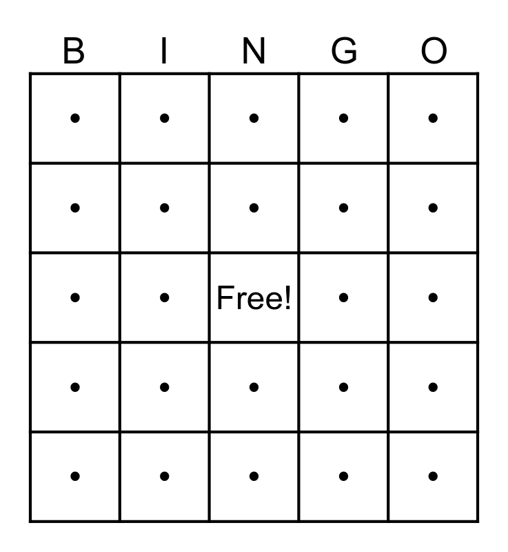 This bingo card has a free space and 24 words: •, •, •, •, •, •, •, •, •, •, •, •, •, •, •, •, •, •, •, •, •, •, • and •.