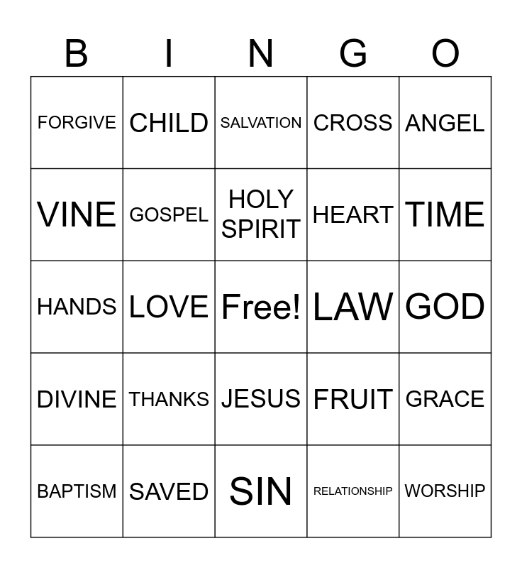 This bingo card has a free space and 39 words: WORK(S), COMFORT, TRUE/TRUTH, GOSPEL, BAPTISM, JESUS, HOLY SPIRIT, VALUES, ANGEL, DIVINE, LOVE, CROSS, WORSHIP, GOD, LAW, THANKS, OTHERS, FORGIVE, MERCY, FRUIT, VINE, SIN, HEART, TIME, TALENT, TREASURE, CREATION, BREAD, WINE, CHILD, SAINT, SINNER, SALVATION, SAVED, RELATIONSHIP, COMMUNITY, GRACE, HANDS and PERICOPE.