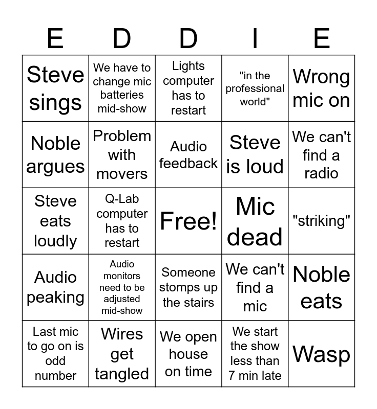 This bingo card has a free space and 50 words: Eddie turns on a mic late, Wasp, "that's a tomorrow problem", We open house on time, Audio monitors need to be adjusted mid-show, Someone else gets a bingo, We have to change mic batteries mid-show, Q-Lab audio comes through computer instead of board, Noble argues, Fiber doesn't work, Problem with movers, "in the professional world", Noble eats, We can't find a mic, Radio cluster, Cast forgets a line, Audio feedback, Mic dead, Someone backseat does a job, Wrong mic on, Q-Lab computer has to restart, We start the show less than 7 min late, Steve sings, Steve is loud, We start the show less than 10 min late, Audience laughs, We can't find a radio, Scrim fails, Lights computer has to restart, Someone stomps up the stairs, Larsen cackles, Larsen sings, 2+ Nobles in the booth at once, Cast doesn't stay in light, Wires get tangled, Projector problems, Intermission is less than 15 min, LED lights break, "you need a hobby", "striking", We mic on time, 3+ Nobles in the booth at once, Intermission is less than 20 minutes, Last mic to go on is even number, Last mic to go on is odd number, Steve eats loudly, Stage crew runs across stage in blackout, Wrong lighting cue, Audio peaking and Eddie tries to fake a goal.