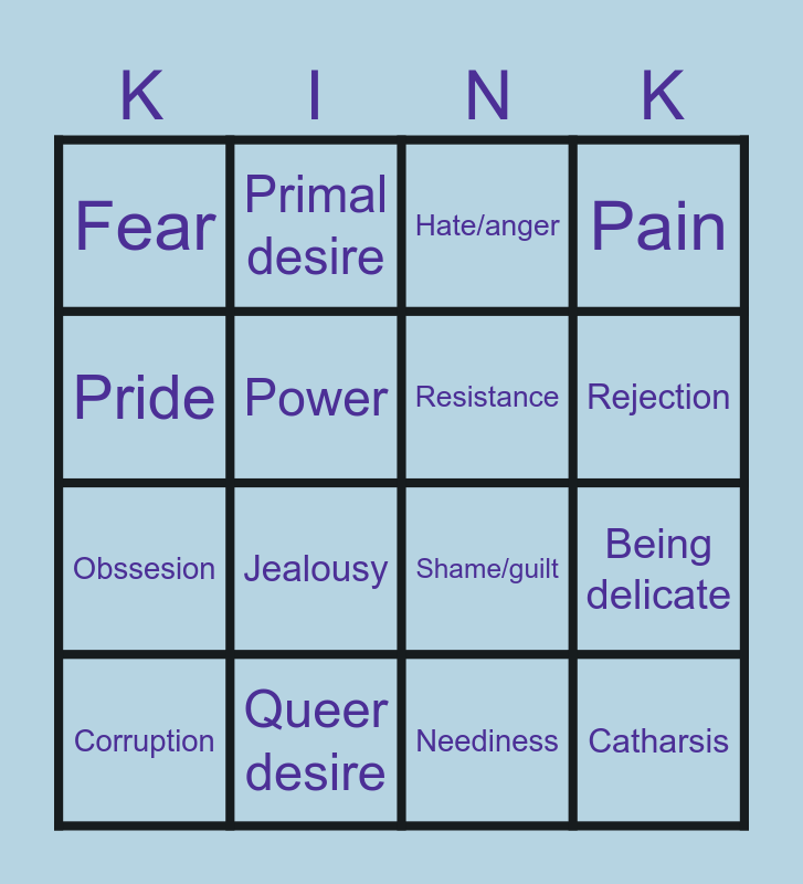 This bingo card has 16 words: Queer desire, Being delicate, Hate/anger, Fear, Obssesion, Primal desire, Shame/guilt, Neediness, Pride, Power, Corruption, Pain, Jealousy, Rejection, Resistance and Catharsis.