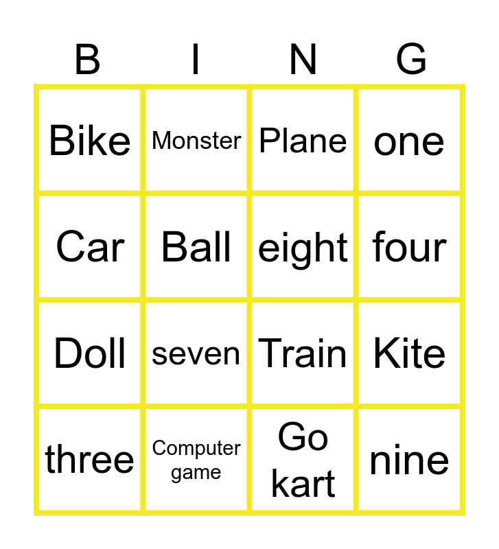 This bingo card has 16 words: Computer game, Kite, Plane, Bike, Doll, Monster, Train, Go kart, Car, Ball, three, one, seven, four, eight and nine.