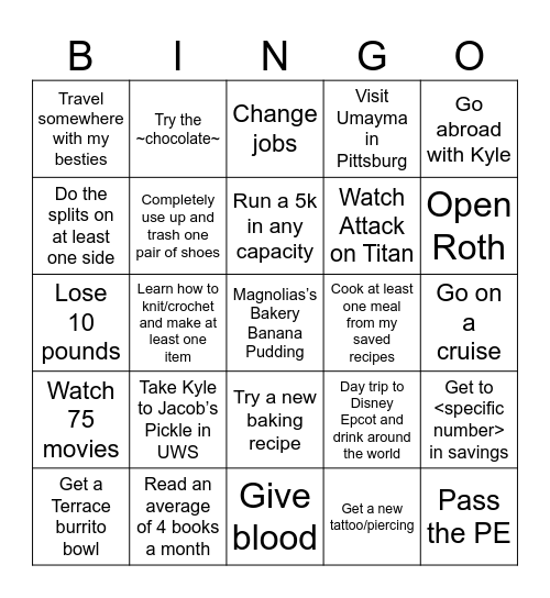 This bingo card has a free space and 24 words: Take Kyle to Jacob’s Pickle in UWS, Read an average of 4 books a month, Run a 5k in any capacity, Get a Terrace burrito bowl, Go abroad with Kyle, Travel somewhere with my besties, Do the splits on at least one side, Try the ~chocolate~, Cook at least one meal from my saved recipes, Try a new baking recipe, Watch Attack on Titan, Lose 10 pounds, Day trip to Disney Epcot and drink around the world, Get to <specific number> in savings, Completely use up and trash one pair of shoes, Get a new tattoo/piercing, Go on a cruise, Change jobs, Open Roth, Learn how to knit/crochet and make at least one item, Pass the PE, Watch 75 movies, Visit Umayma in Pittsburg and Give blood.