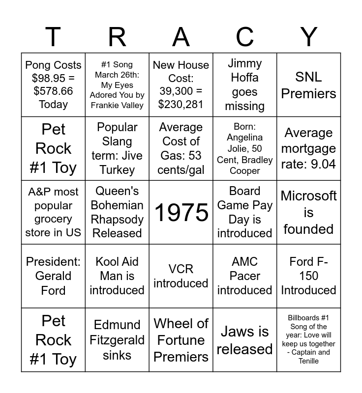 This bingo card has a free space and 29 words: Pet Rock #1 Toy, Amity Murder Trial Begins, Queen's Bohemian Rhapsody Released, Jimmy Hoffa goes missing, Pong Costs $98.95 = $578.66 Today, New House Cost: 39,300 = $230,281, Popular Slang term: Jive Turkey, Kool Aid Man is introduced, Board Game Pay Day is introduced, Edmund Fitzgerald sinks, Microsoft is founded, Billboards #1 Song of the year: Love will keep us together - Captain and Tenille, Wheel of Fortune Premiers, Jaws is released, Average mortgage rate: 9.04, War Head Candy introduced, VCR introduced, President: Gerald Ford, SNL Premiers, A&P most popular grocery store in US, AMC Pacer introduced, Philadelphia Flyers win Stanley Cup, Born: Angelina Jolie, 50 Cent, Bradley Cooper, Pet Rock #1 Toy, Jimmy Hoffa goes missing, #1 Song March 26th: My Eyes Adored You by Frankie Valley, Ford F-150 Introduced, Average Cost of Gas: 53 cents/gal and All in the family #1 TV Show.