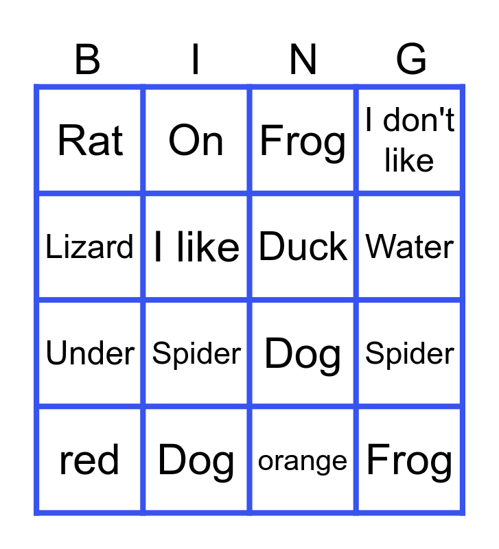 This bingo card has 30 words: Donkey, Elephant, Spider, Cat, Rat, Frog, Duck, Lizard, Dog, yellow, orange, red, Donkey, Elephant, Spider, Cat, Rat, Frog, Duck, Lizard, Dog, In, On, Under, I like, I don't like, Shelter, Food, Water and Air.