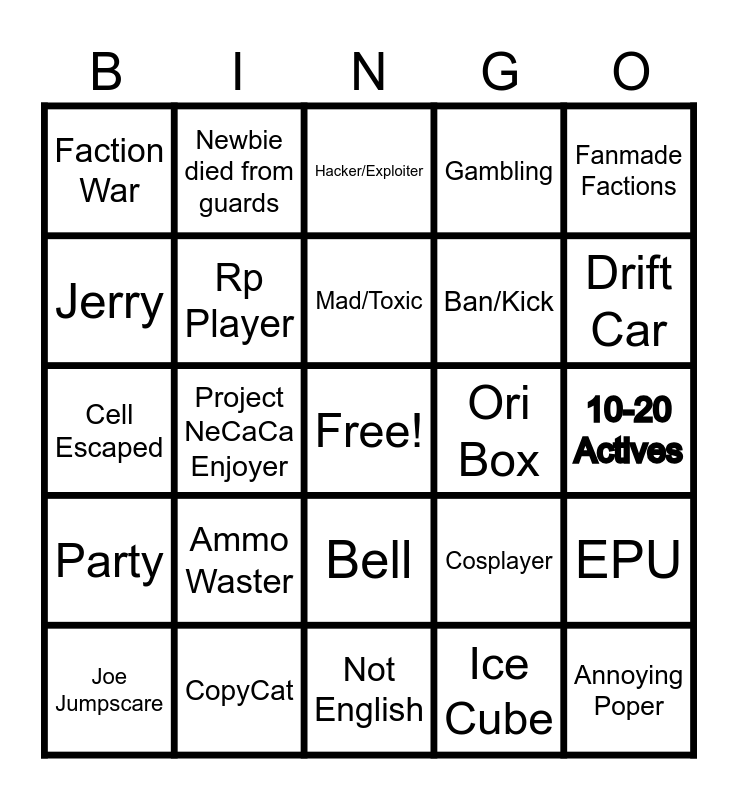 This bingo card has a free space and 24 words: Joe Jumpscare, Ammo Waster, Mad/Toxic, Ice Cube, Fanmade Factions, Faction War, Newbie died from guards, Hacker/Exploiter, Ori Box, 10-20 Actives, Cell Escaped, Rp Player, Cosplayer, EPU, Jerry, CopyCat, Not English, Gambling, Drift Car, Party, Project NeCaCa Enjoyer, Bell, Ban/Kick and Annoying Poper.