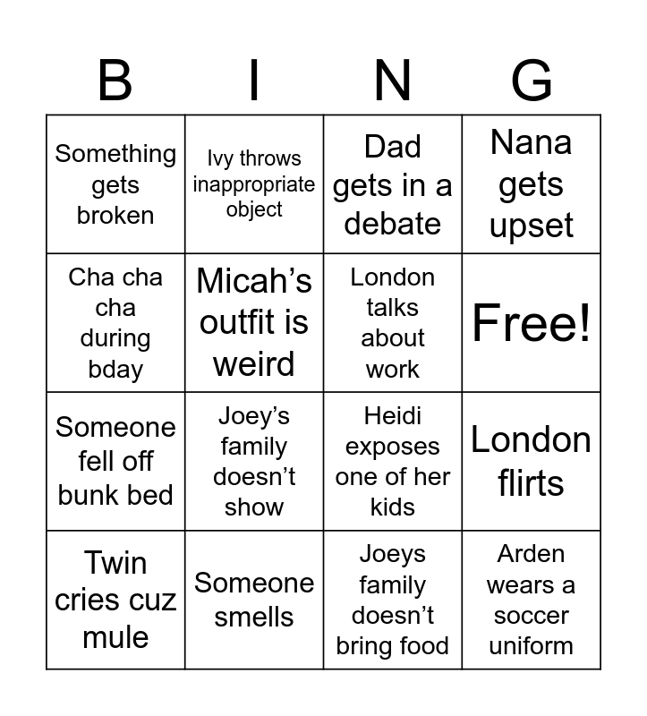 This bingo card has 18 words: Joey’s family doesn’t show, Arden wears a soccer uniform, Dad gets in a debate, Something gets broken, Heidi exposes one of her kids, Nana gets upset, Twin cries cuz mule, Ivy throws inappropriate object, Free!, Someone fell off bunk bed, Joeys family doesn’t bring food, Cha cha cha during bday, London flirts, Micah’s outfit is weird, London talks about work, Eli bullies, Someone smells and Complain about Joey and Molly.