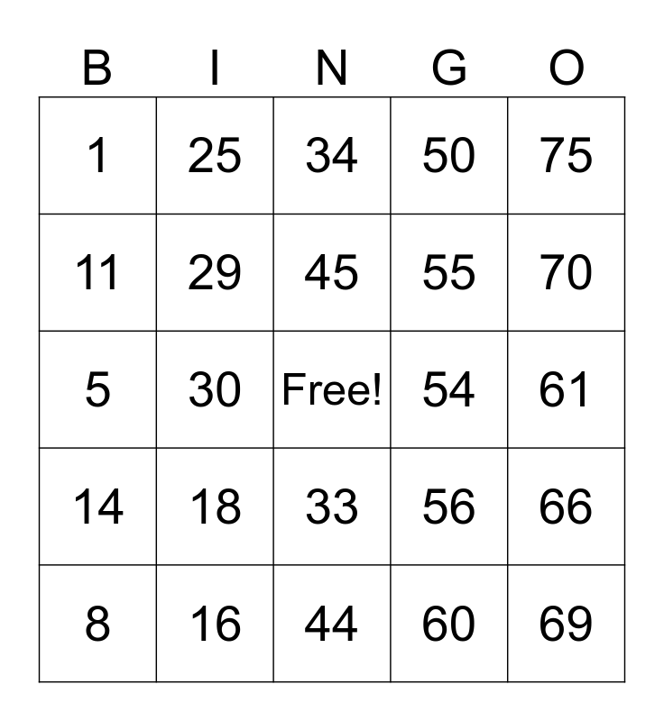 This bingo card has a free space and 24 words: 8, 18, 45, 60, 75, 1, 25, 34, 54, 61, 5, 29, 56, 66, 11, 16, 44, 50, 70, 14, 30, 33, 55 and 69.