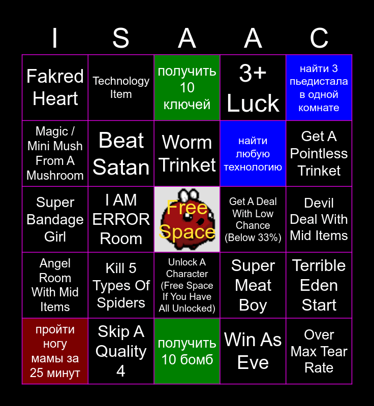 This bingo card has a free space and 94 words: получить 20 монет, получить тир 4 предмет, получить 10 бомб, убить ногу мамы, получить 7 контейнеров сердец, поднять 7 монет в одной комнате, сделать 2 сделки с дьяволом, пройти ногу мамы за 25 минут, найти библиотеку, получить 4 бейбика (фамилиара), достигнуть 7 урон, достигнуть отрицательной удачи, найти 4 секркетки, найти любую технологию, получить полет, найти 3 пьедистала в одной комнате, получить 10 ключей, достигнуть удачи 3, купить 4 предмета в одном магазине, пройти босс челлендж, возродится, найти 2 тир 4 предмета, найти 40 монет, убить 5 пауков в одной комнате, Kill 5 Types Of Spiders, Beat Satan, Beat Isaac, Donate 25 Coins To Donation Machine, Buy 3 Things From A Shop, Beat A Gurdy Related Boss, Skip A Quality 4, Unlock A Character (Free Space If You Have All Unlocked), Brimstone, Sacred Heart, Technology Item, Melee Item (Spirit Sword, Mom’s Knife), Active Item In Treasure Room, Trinket With 8+ Letters, Worm Trinket, Super Meat Boy, Super Bandage Girl, Angel Room With Mid Items, Devil Deal With Mid Items, Boss Beaten In Under A Minute, Over Max Tear Rate, Win as Judas, Win As Isaac, Win As Magdalene, Win As Cain, Win As Lilith, Win As Azazel, Win As Eve, Win As Samson, Win With No Red Heart Containers, Sin Miniboss, Low Weight Room, Pay Out A Blood Donation Machine, 3 Defensive Items, Start With Insane Items As Eden, Gold Pickup, I AM ERROR Room, Free Bookworm In Libary (3+ Books), 3 Curses In A Run, Win With An Easter Egg Seed Active, 2+ Champion Enemies In A Room, Polyphemus, Kill 2 Angels, Beat Mom, Magic / Mini Mush From A Mushroom, CHAOS!!!, Secret Room Is Pointless, Crawlspace, Double Trouble, Lucky Penny, 3+ Luck, Get A Pointless Item (PHD As Cain, Etc.), Quality 0, Get A Pointless Trinket, Terrible Eden Start, Quality 3, Ghost Boss Shows Up, Bedroom, Dice Room, Get A Deal With Low Chance (Below 33%), Fakred Heart, Commit To Devil Rooms, Commit To Angel Rooms, Boss Item Sucks, Too Many HP Ups, Perfection Trinket, Planetarium, Awful Active Item, Jam A Dono Machine and Find A Syringe.