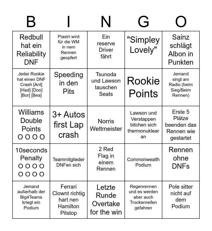 This bingo card has a free space and 24 words: Teammitglieder DNFen sich, Ferrari Clownt richtig hart nen Hamilton Pitstop, Tsunoda und Lawson tauschen Seats, Jemand außerhalb der Big4Teams kriegt ein Podium, Sainz schlägt Albon in Punkten, Redbull hat ein Reliability DNF, Jeder Rookie hat einen DNF Crash [Ant] [Had] [Doo] [Bor] [Bea], Piastri wird für die WM in nem Rennen geopfert, Lawson und Verstappen bitchen sich thermonuklear an, 2 Red Flag in einem Rennen, Rookie Points, Williams Double Points O O O O, Commonwealth Podium, Rennen ohne DNFs, Speeding in den Pits, Regenrennen und es werden aber auch Trockenreifen gefahren, Erste 5 Plätze beenden das Rennen wie gestartet, Ein reserve Driver fährt, Jemand singt am Radio (beim Sieg/Beim Rennen), 3+ Autos first Lap crash, Pole sitter nicht auf dem Podium, 10seconds Penalty O O O O O O O O, "Simpley Lovely" and Letzte Runde Overtake for the win.