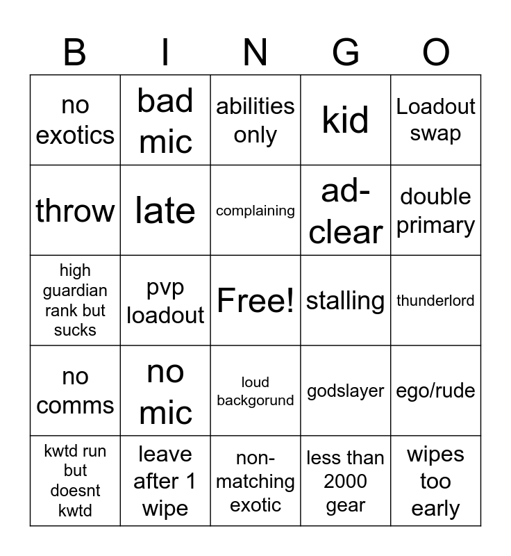 This bingo card has a free space and 24 words: no mic, leave after 1 wipe, complaining, kwtd run but doesnt kwtd, Loadout swap, no exotics, throw, bad mic, stalling, loud backgorund, ad-clear, high guardian rank but sucks, godslayer, ego/rude, late, less than 2000 gear, thunderlord, abilities only, double primary, pvp loadout, wipes too early, no comms, kid and non-matching exotic.