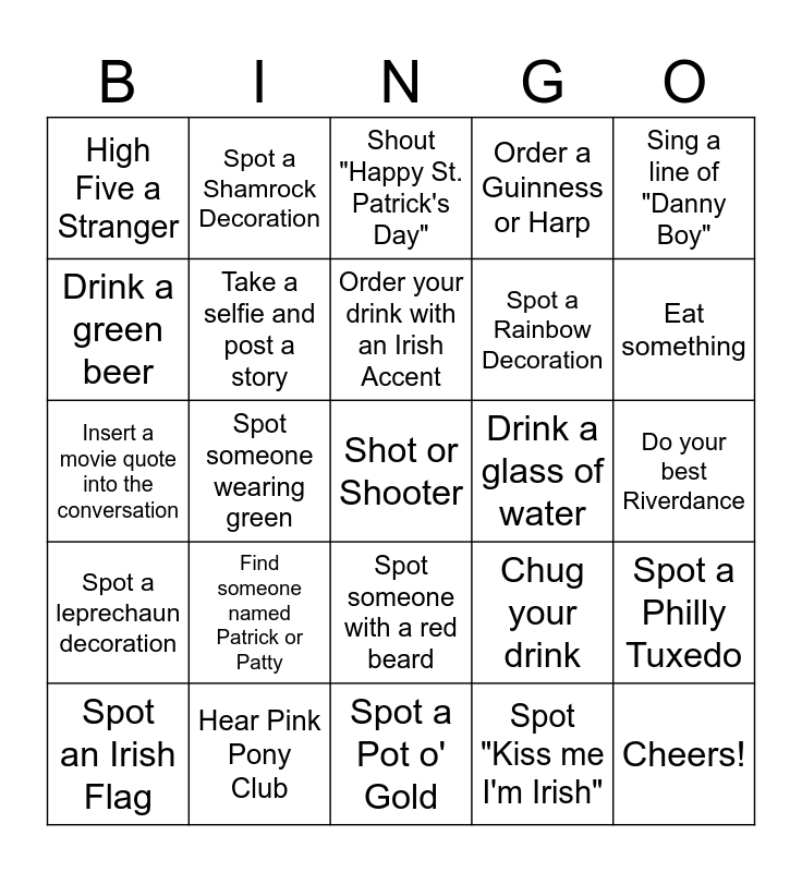 This bingo card has a free space and 24 words: Find someone named Patrick or Patty, Hear Pink Pony Club, Order your drink with an Irish Accent, Spot an Irish Flag, Sing a line of "Danny Boy", High Five a Stranger, Drink a green beer, Spot a Shamrock Decoration, Drink a glass of water, Spot someone with a red beard, Spot a Rainbow Decoration, Insert a movie quote into the conversation, Chug your drink, Spot a Philly Tuxedo, Take a selfie and post a story, Spot "Kiss me I'm Irish", Do your best Riverdance, Shout "Happy St. Patrick's Day", Eat something, Spot someone wearing green, Cheers!, Spot a leprechaun decoration, Order a Guinness or Harp and Spot a Pot o' Gold.