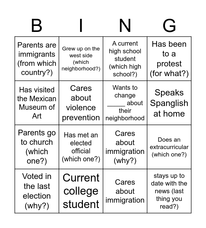 This bingo card has 18 words: Has met an elected official (which one?), stays up to date with the news (last thing you read?), A current high school student (which high school?), Parents are immigrants (from which country?), Cares about immigration (why?), Has been to a protest (for what?), Voted in the last election (why?), Grew up on the west side (which neighborhood?), Speaks Spanglish at home, Parents go to church (which one?), Cares about immigration, Has visited the Mexican Museum of Art, Does an extracurricular (which one?), Cares about violence prevention, Wants to change _____ about their neighborhood, Is looking for scholarships, Current college student and In high school.