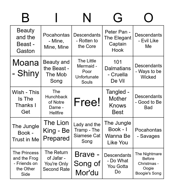 This bingo card has a free space and 24 words: The Lion King - Be Prepared, The Return of Jafar - You're Only Second Rate, The Little Mermaid - Poor Unfortunate Souls, The Princess and the Frog - Friends on the Other Side, Descendants - Evil Like Me, Beauty and the Beast - Gaston, Moana - Shiny, Pocahontas - Mine, Mine, Mine, Tangled - Mother Knows Best, Lady and the Tramp - The Siamese Cat Song, 101 Dalmatians - Cruella De Vil, Wish - This Is The Thanks I Get, The Jungle Book - I Wanna Be Like You, Pocahontas - Savages, Beauty and the Beast - The Mob Song, Descendants - Do What You Gotta Do, Descendants - Good to Be Bad, Descendants - Rotten to the Core, Descendants - Ways to be Wicked, The Hunchback of Notre Dame - Hellfire, The Nightmare Before Christmas - Oogie Boogie's Song, The Jungle Book - Trust in Me, Peter Pan - The Elegant Captain Hook and Brave - Song of Mor'du.