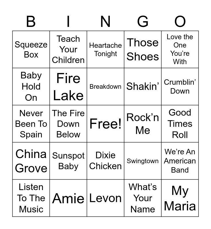 This bingo card has a free space and 34 words: Love Is Alive, What’s Your Name, Take The Money And Run, Draggin’ The Line, China Grove, Fire Lake, Love the One You’re With, Listen To The Music, Teach Your Children, Signs, Breakdown, Heartache Tonight, Wild Night, Lady, Rock’n Me, Crumblin’ Down, Amie, Never Been To Spain, Sunspot Baby, Swingtown, Dixie Chicken, We Just Disagree, Squeeze Box, Good Times Roll, Levon, My Maria, Those Shoes, Mr. Bojangles, Shakin’, Baby Hold On, Here Comes My Girl, The Fire Down Below, We’re An American Band and Love Is Alive.