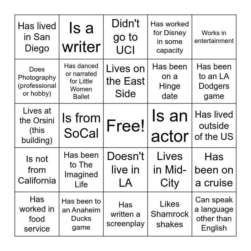 This bingo card has a free space and 33 words: Went to UCI, Has done improv, Is from SoCal, Is from NorCal, Is not from California, Has danced or narrated for Little Women Ballet, Works in entertainment, Has worked in food service, Is a writer, Lives on the West Side, Lives on the East Side, Didn't go to UCI, Is in school/classes, Owns a business, Is an actor, Has been to an LA Dodgers game, Has been to an Anaheim Ducks game, Lives at the Orsini (this building), Has been to The Imagined Life, Lives in Mid-City, Doesn't live in LA, Grew up in Orange County, Has lived in San Diego, Has lived outside of the US, Has written a screenplay, Can speak a language other than English, Has worked for Disney in some capacity, Has been on a Hinge date, Does Photography (professional or hobby), Has been on a cruise, Has some Irish ancestry (on theme?), Likes Shamrock shakes and Has been to Ireland before.