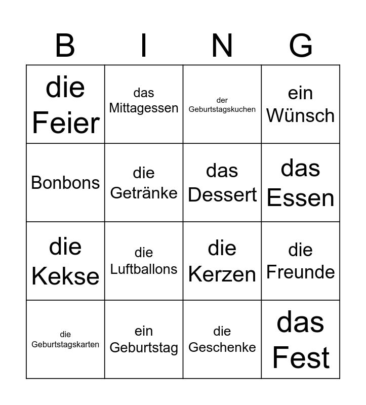 This bingo card has 16 words: ein Geburtstag, die Freunde, der Geburtstagskuchen, die Feier, die Kekse, das Mittagessen, die Kerzen, die Geschenke, Bonbons, die Getränke, die Geburtstagskarten, ein Wünsch, die Luftballons, das Essen, das Dessert and das Fest.