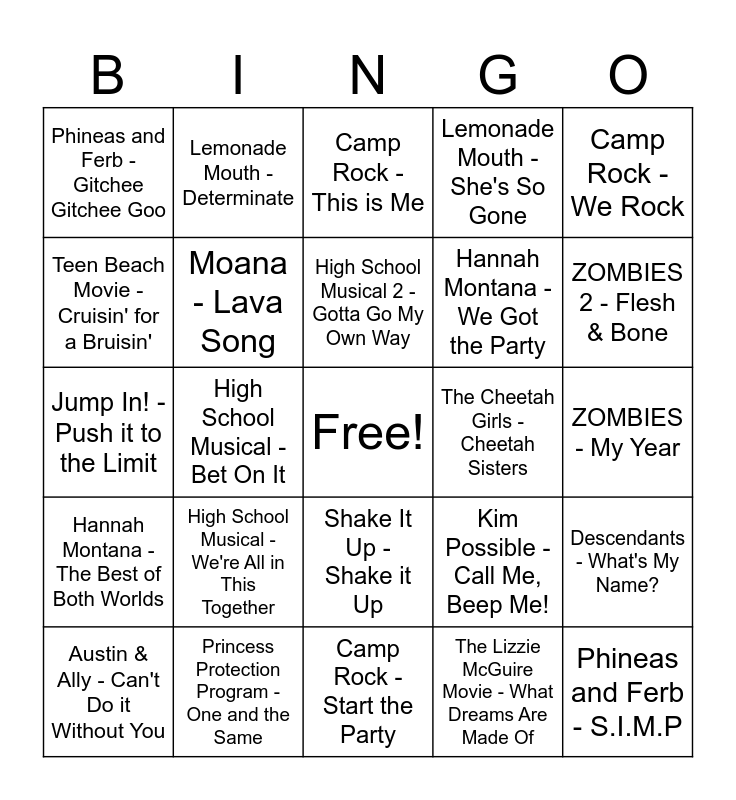 This bingo card has a free space and 25 words: High School Musical - We're All in This Together, Camp Rock - Start the Party, High School Musical 2 - Gotta Go My Own Way, Austin & Ally - Can't Do it Without You, Camp Rock - We Rock, Phineas and Ferb - Gitchee Gitchee Goo, Teen Beach Movie - Cruisin' for a Bruisin', Lemonade Mouth - Determinate, The Cheetah Girls - Cheetah Sisters, Shake It Up - Shake it Up, Hannah Montana - We Got the Party, Jump In! - Push it to the Limit, Kim Possible - Call Me, Beep Me!, Descendants - What's My Name?, Moana - Lava Song, Camp Rock - Play My Music, ZOMBIES - My Year, Camp Rock - This is Me, ZOMBIES 2 - Flesh & Bone, High School Musical - Bet On It, Phineas and Ferb - S.I.M.P, Princess Protection Program - One and the Same, Hannah Montana - The Best of Both Worlds, Lemonade Mouth - She's So Gone and The Lizzie McGuire Movie - What Dreams Are Made Of.