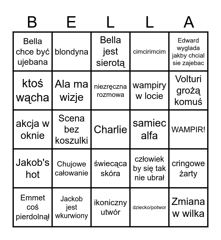 This bingo card has a free space and 29 words: Emmet coś pierdolnął, czerwone oczy, Scena bez koszulki, Edward jest creepem, Bella chce być ujebana, Bella jest sierotą, Ala ma wizje, Chujowe całowanie, samiec alfa, Jackob jest wkurwiony, WAMPIR!, Zmiana w wilka, ikoniczny utwór, dziecko/potwor, Volturi grożą komuś, artystyczny kadr, świecąca skóra, Jakob's hot, Edward wyglada jakby chcial sie zajebac, akcja w oknie, człowiek by się tak nie ubrał, nie jestem jak inne, wampiry w locie, ktoś wącha, cimcirimcim, blondyna, cringowe żarty, niezręczna rozmowa and Edward czyta w myslach.