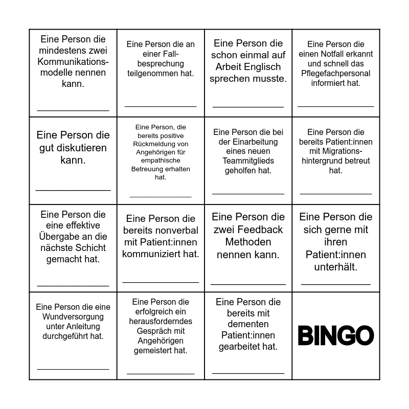 This bingo card has 16 words: Eine Person die erfolgreich ein herausforderndes Gespräch mit Angehörigen gemeistert hat. _______________, Eine Person die sich gerne mit ihren Patient:innen unterhält. ____________, Eine Person die schon einmal auf Arbeit Englisch sprechen musste. _____________, Eine Person die mindestens zwei Kommunikations-modelle nennen kann. ______________, Eine Person die eine effektive Übergabe an die nächste Schicht gemacht hat. ______________, Eine Person die an einer Fall-besprechung teilgenommen hat. ________________, Eine Person die zwei Feedback Methoden nennen kann. _____________, Eine Person die bereits mit dementen Patient:innen gearbeitet hat. ______________, Eine Person die gut diskutieren kann. _____________, Eine Person, die bereits positive Rückmeldung von Angehörigen für empathische Betreuung erhalten hat. ________________, Eine Person die eine Wundversorgung unter Anleitung durchgeführt hat. ________________, Eine Person die einen Notfall erkannt und schnell das Pflegefachpersonal informiert hat. _________________, Eine Person die bereits nonverbal mit Patient:innen kommuniziert hat. ______________, Eine Person die bereits Patient:innen mit Migrations-hintergrund betreut hat. ________________, Eine Person die bei der Einarbeitung eines neuen Teammitglieds geholfen hat. ________________ and BINGO.