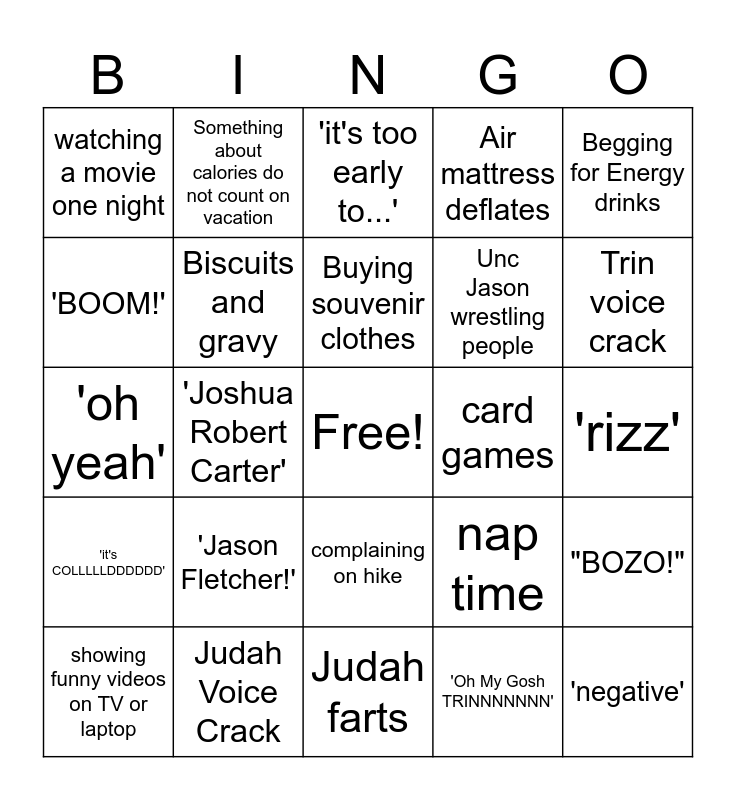 This bingo card has a free space and 24 words: 'Jason Fletcher!', Judah Voice Crack, Buying souvenir clothes, showing funny videos on TV or laptop, Begging for Energy drinks, watching a movie one night, 'BOOM!', Something about calories do not count on vacation, card games, complaining on hike, Unc Jason wrestling people, 'oh yeah', nap time, "BOZO!", Biscuits and gravy, 'Oh My Gosh TRINNNNNNN', 'rizz', 'it's too early to...', Trin voice crack, 'Joshua Robert Carter', 'negative', 'it's COLLLLLDDDDDD', Air mattress deflates and Judah farts.