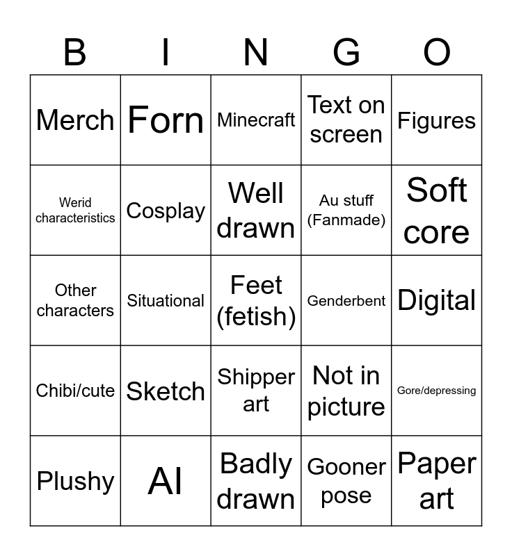 This bingo card has 25 words: Sketch, Badly drawn, Well drawn, Plushy, Figures, Merch, Werid characteristics, Forn, Genderbent, Shipper art, Au stuff (Fanmade), Other characters, Not in picture, Gore/depressing, Cosplay, Paper art, Digital, Minecraft, Soft core, Situational, Feet (fetish), AI, Chibi/cute, Text on screen and Gooner pose.